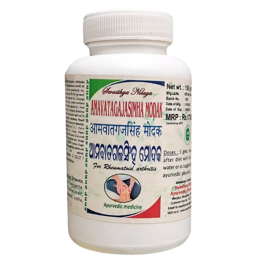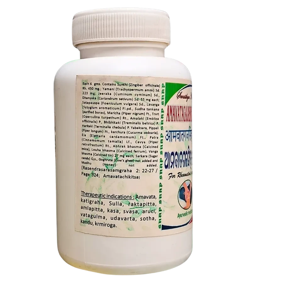 AMAVATAGAJASMHA MODAK is a traditional Ayurvedic formulation known for its therapeutic properties. It is commonly used to support various health concerns and promote overall wellness. Prepared with time-tested ingredients, AMAVATAGAJASMHA MODAK helps maintain the natural balance of the body and enhances vitality when taken regularly. Ideal for use in holistic and preventive healthcare, this remedy can be a valuable addition to your Ayurvedic lifestyle.