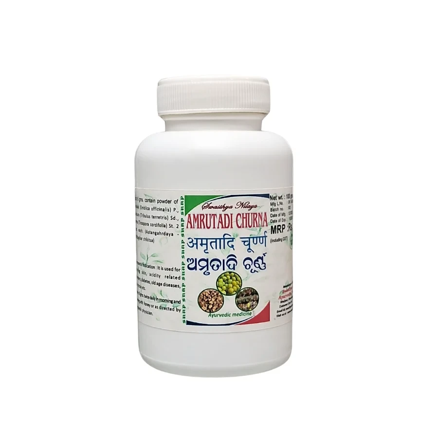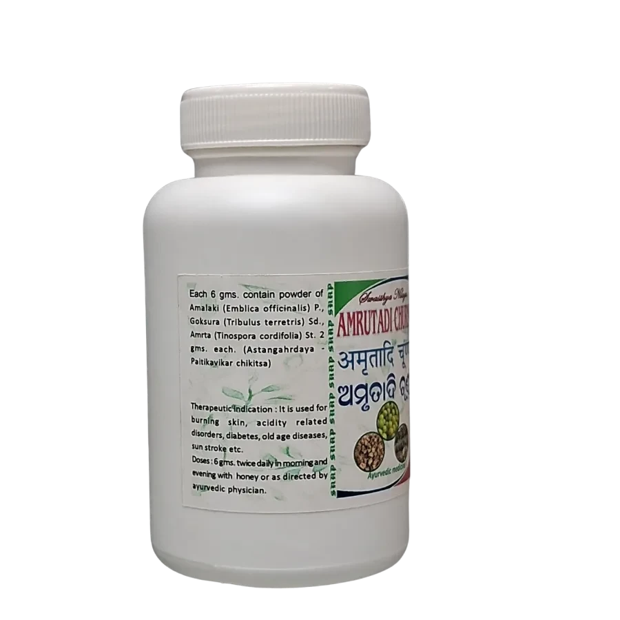 AMRUTADI CHURNA is a traditional Ayurvedic formulation known for its therapeutic properties. It is commonly used to support various health concerns and promote overall wellness. Prepared with time-tested ingredients, AMRUTADI CHURNA helps maintain the natural balance of the body and enhances vitality when taken regularly. Ideal for use in holistic and preventive healthcare, this remedy can be a valuable addition to your Ayurvedic lifestyle.