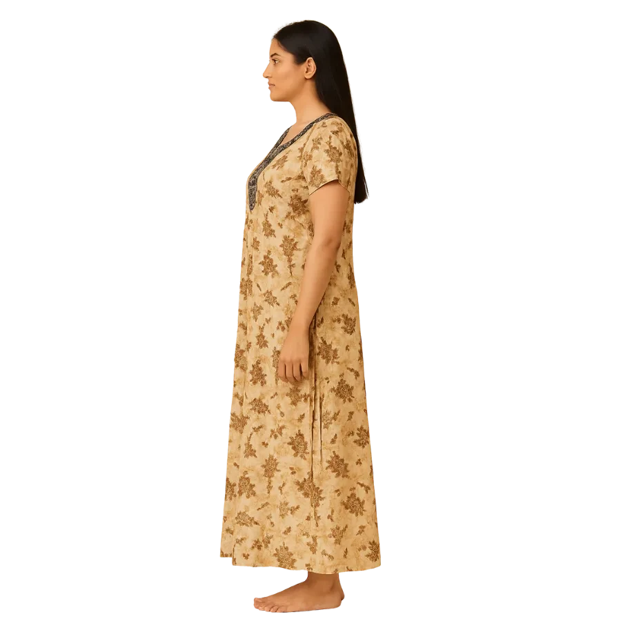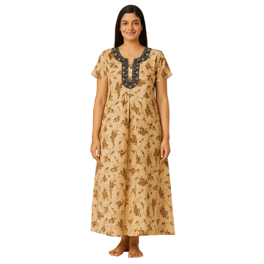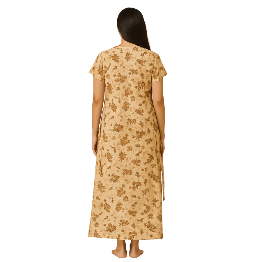Experience effortless comfort with our Beige Floral Aura Cotton Nighty, designed for women who love soft elegance in their daily wear. Crafted from breathable and lightweight cotton fabric, this nighty features a beautiful all-over brown floral print on a soothing beige base, giving it a calm and classic appeal.