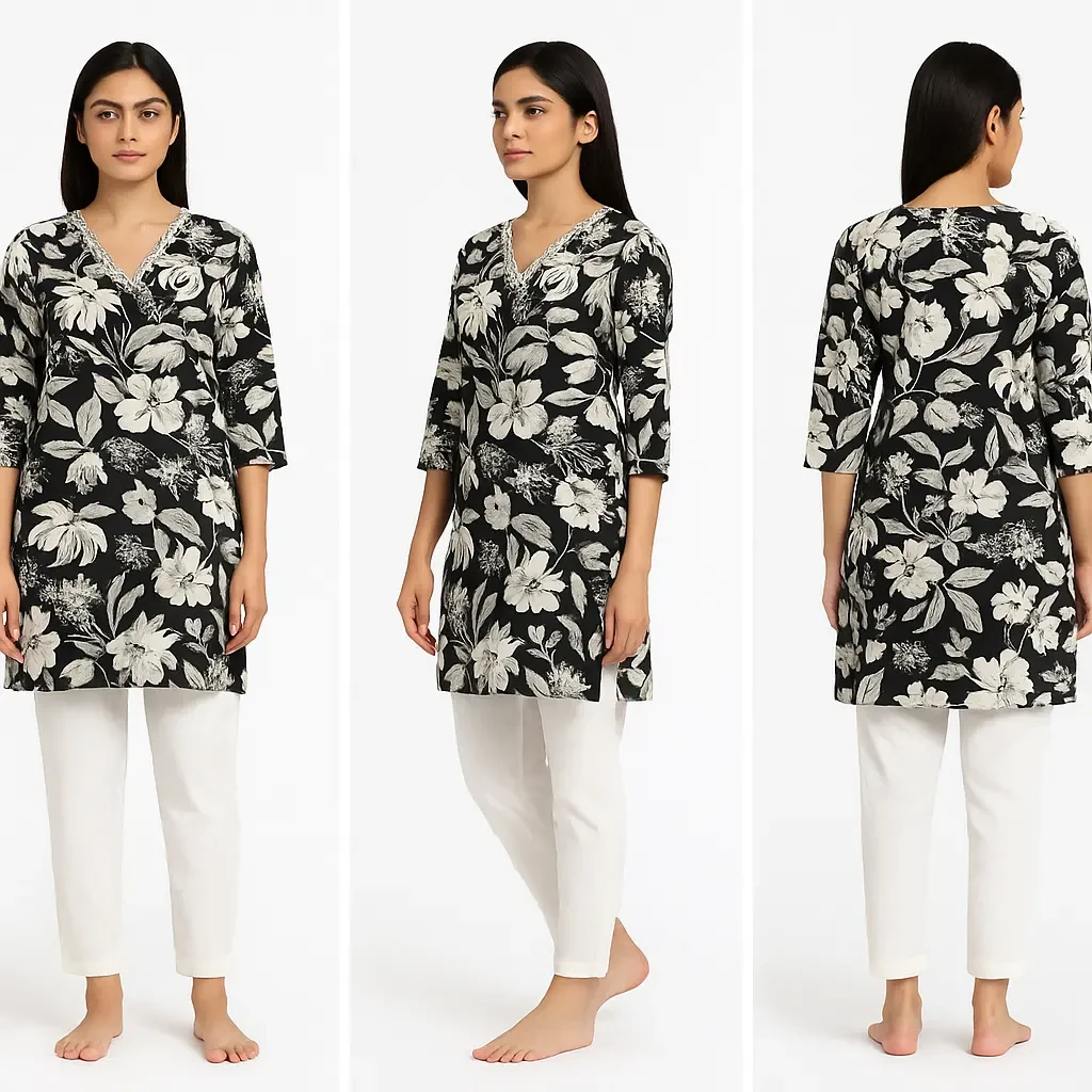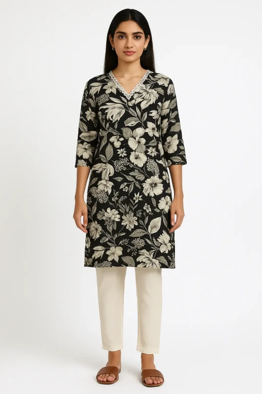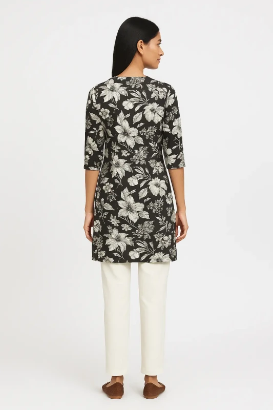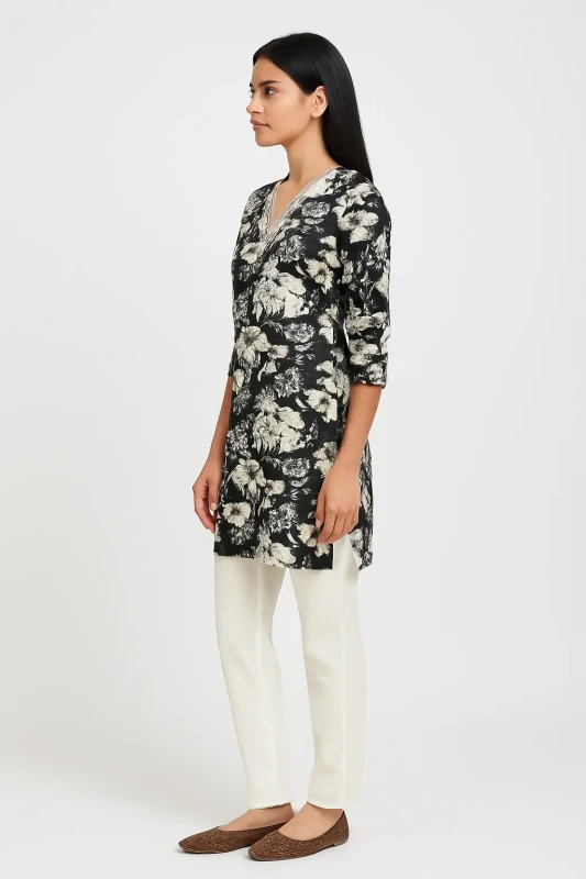 Stunning Contrast: Deep black kurta featuring a vibrant floral print paired with classic white bottoms for a sharp, photogenic look.