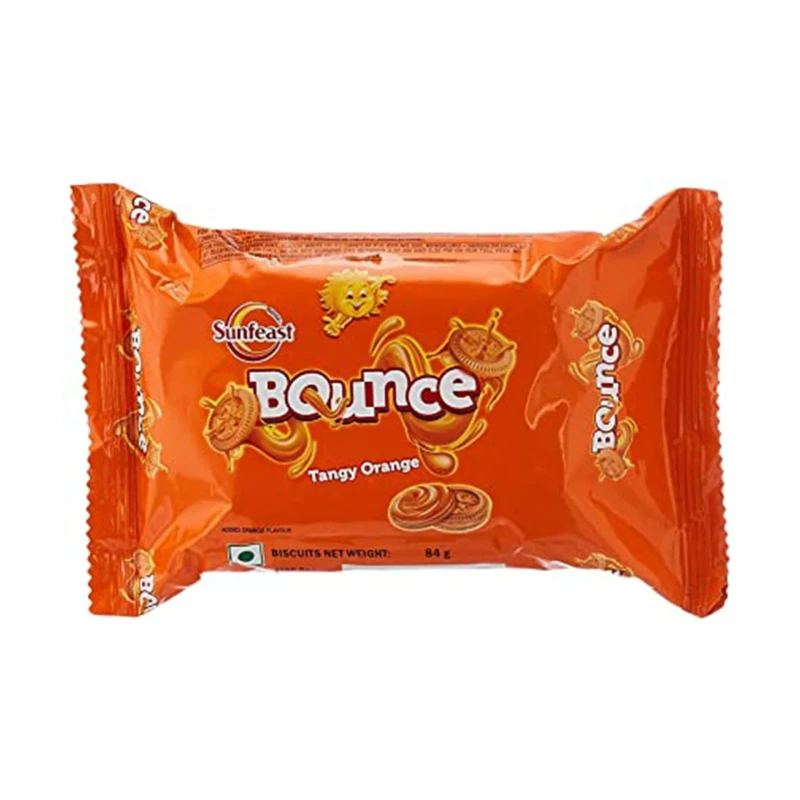 Brighten snack time with Sunfeast Bounce Orange Cream Biscuits, featuring crisp biscuit layers infused with a tangy orange-flavored shell and a smooth, sweet cream center. Each bite offers a lively citrus twist that’s perfect for tea time, on-the-go munching, or mixing in your snack stash