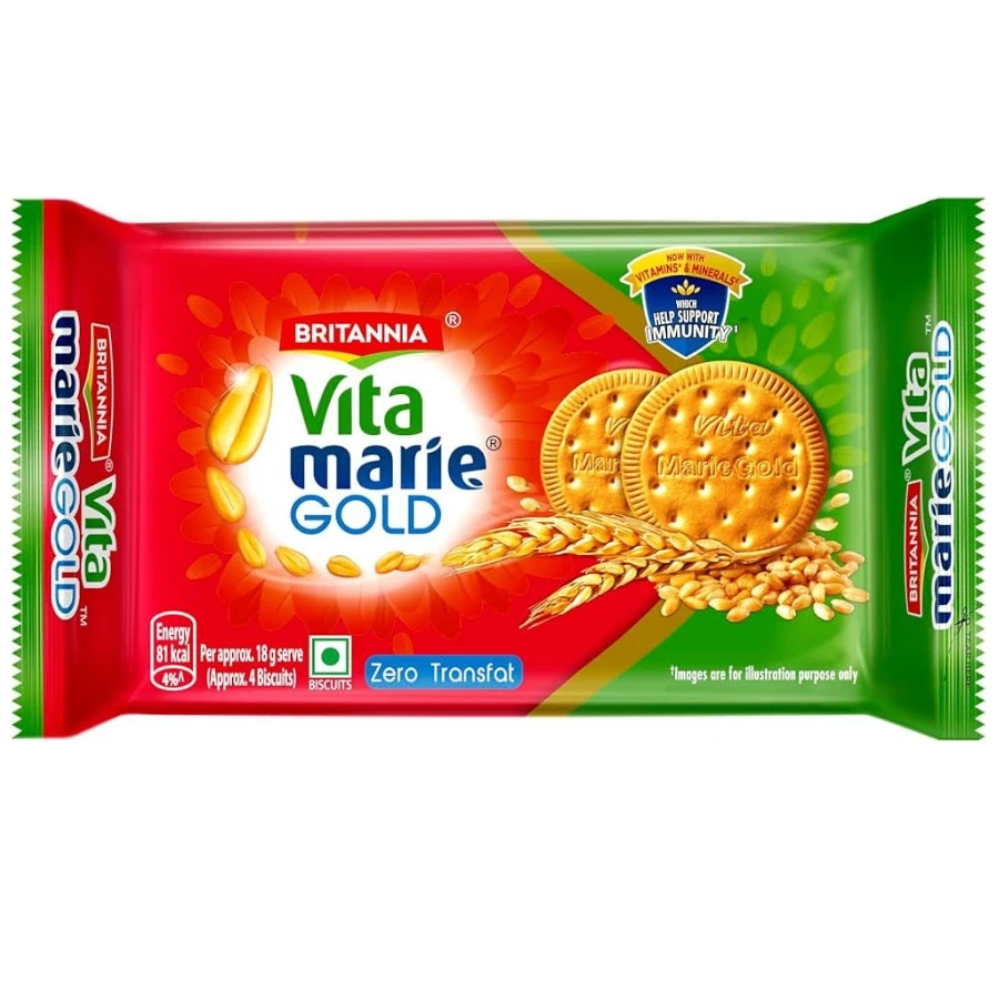 Britannia Vita Marie Gold is a classic Marie-style tea biscuit that blends lightness and crispiness with wholesome nutrition. Baked to golden perfection, it’s enriched with wheat, milk protein, and 10 essential vitamins, making it a smart choice for tea‑time snacking.