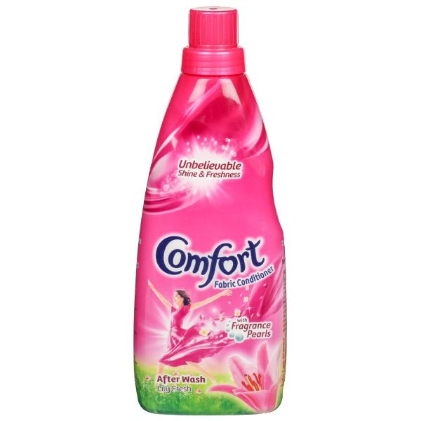 This refers to the 'Comfort' brand of fabric conditioner. The list shows multiple variants like 'BLUE', 'DESIRE', and 'LILY FRESH', with a size of `430 ml'. It's an after-wash product used to add softness and fragrance.