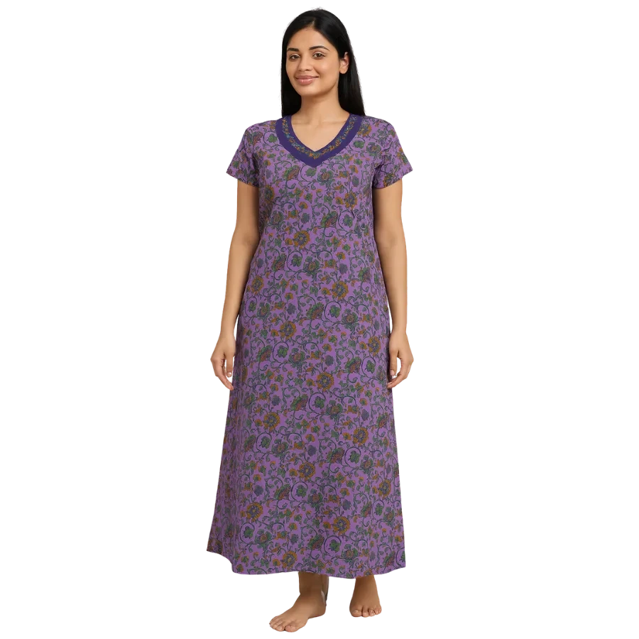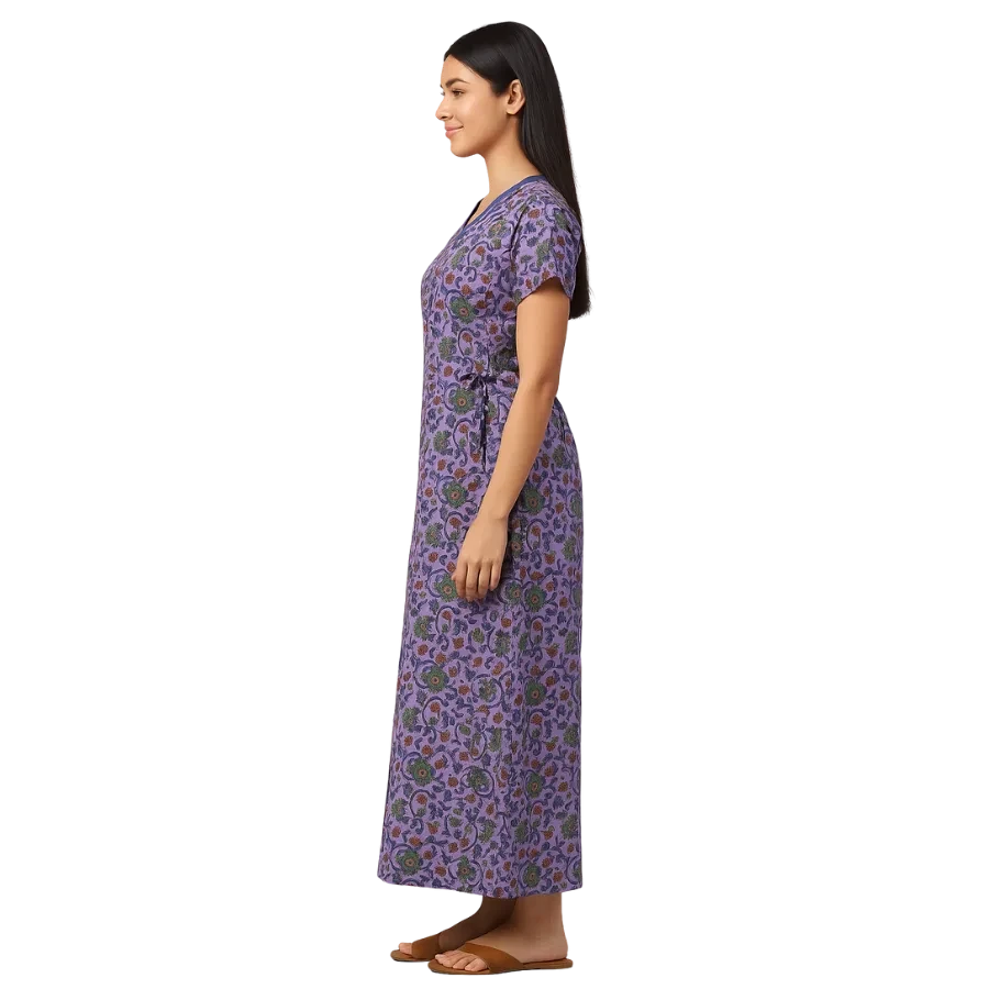 Add a touch of elegance and comfort to your nightwear collection with this Lavender Garden Bloom Printed Cotton Nighty. Designed in a soothing lavender base, the nighty features a beautiful all-over floral pattern with green, orange, and purple motifs, giving it a fresh and vibrant ethnic look.