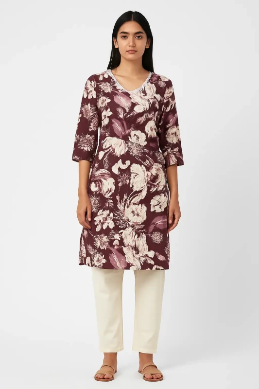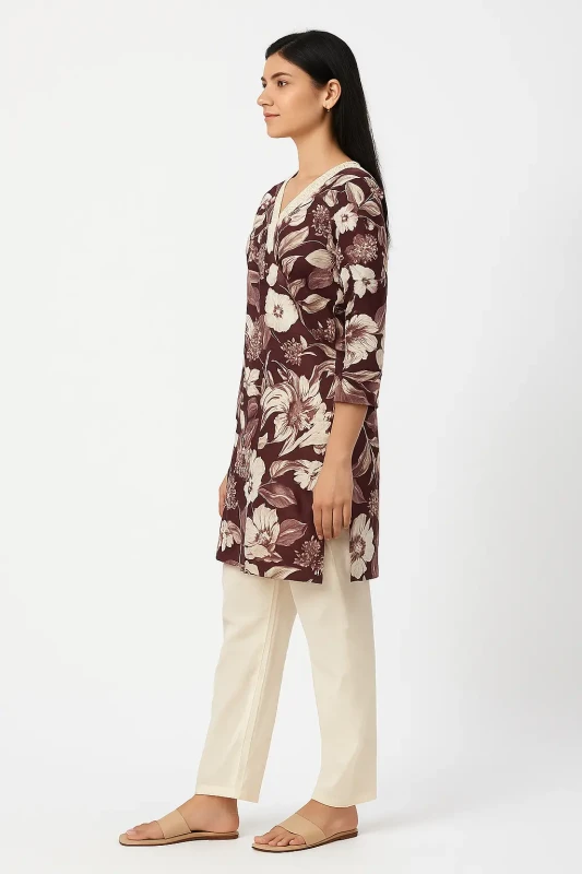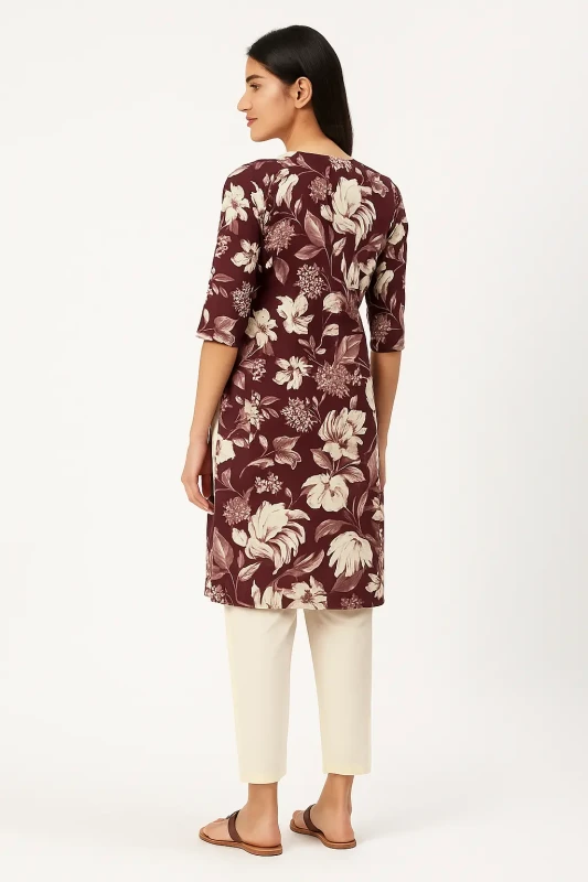 - Design: Elegant maroon A-line kurti featuring delicate floral prints and a sophisticated button-front closure.
