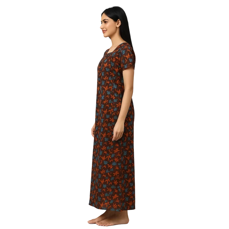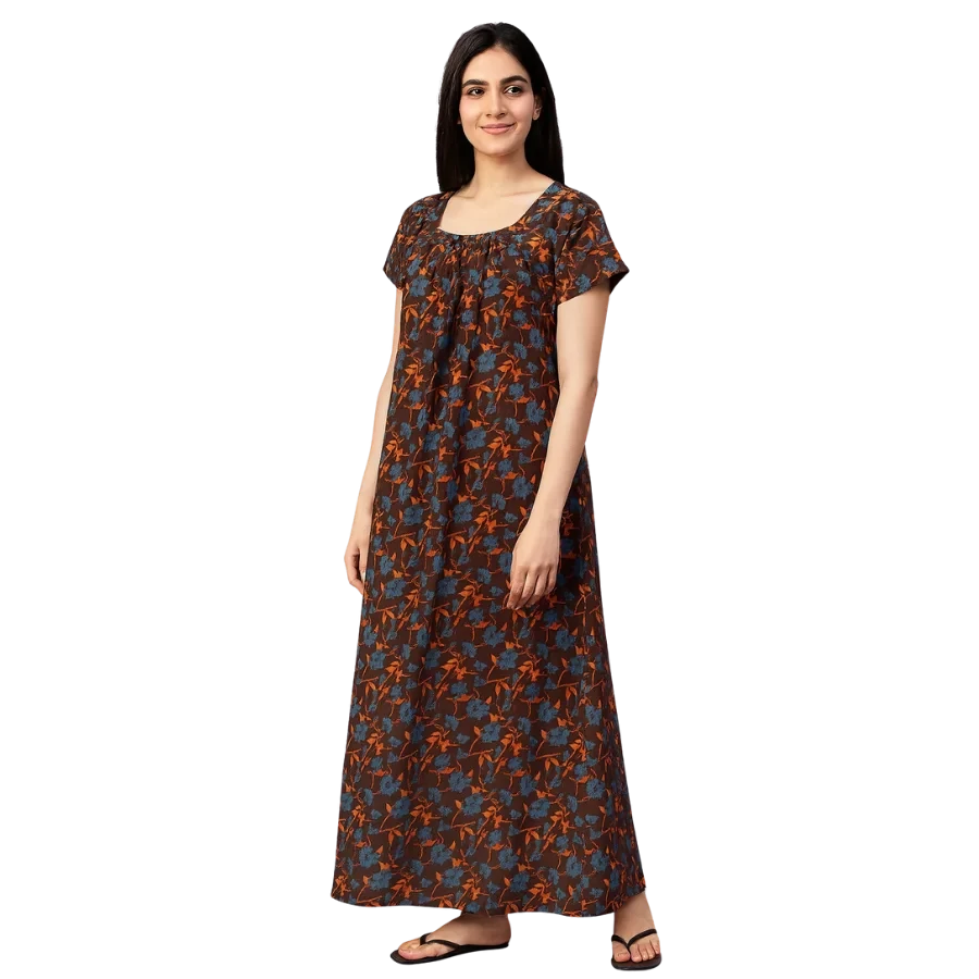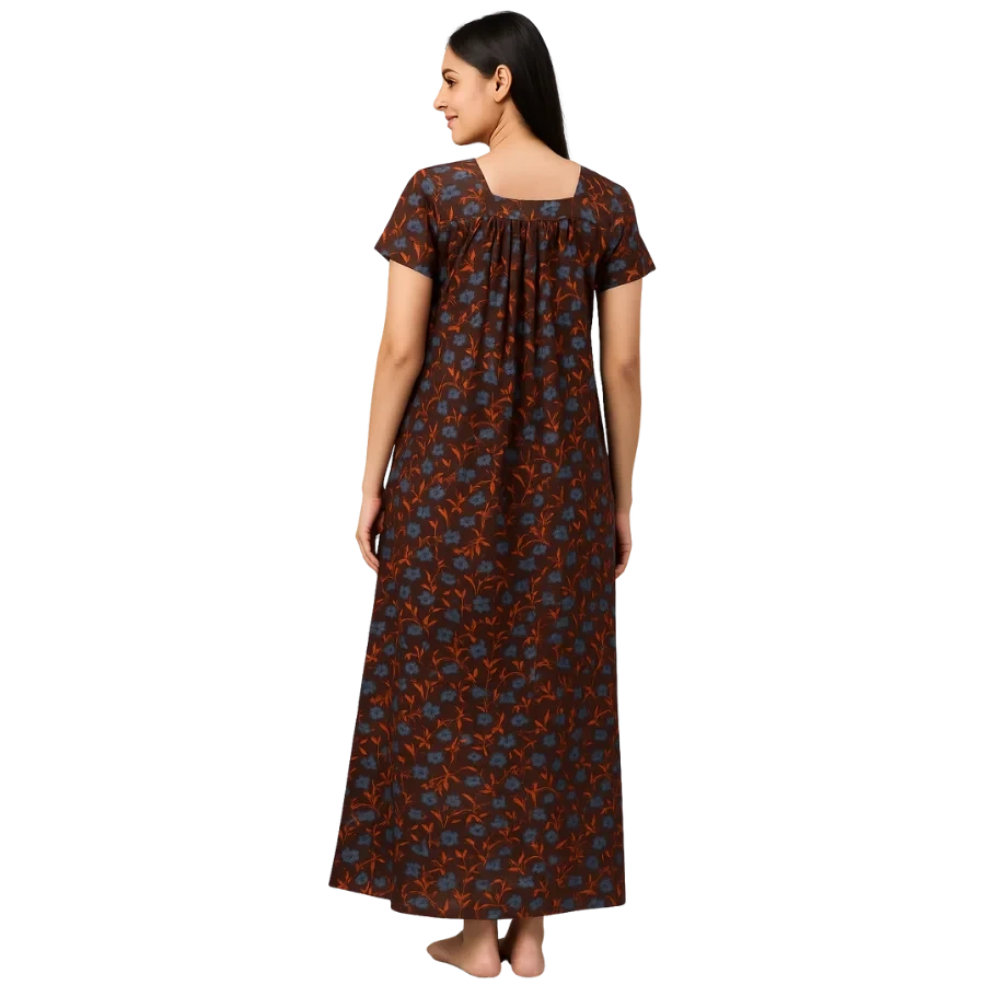 Experience effortless comfort with the Midnight Rust Bloom Printed Cotton Nighty, designed in a deep chocolate brown base highlighted with blue and rust floral motifs for a stylish, earthy look. Tailored from soft and breathable cotton fabric, this nighty offers all-day comfort and irritation-free wear, making it ideal for summer and year-round use. The relaxed A-line fall and round gathered neckline provide a flattering fit while maintaining complete ease of movement for sleep or daily home wear.