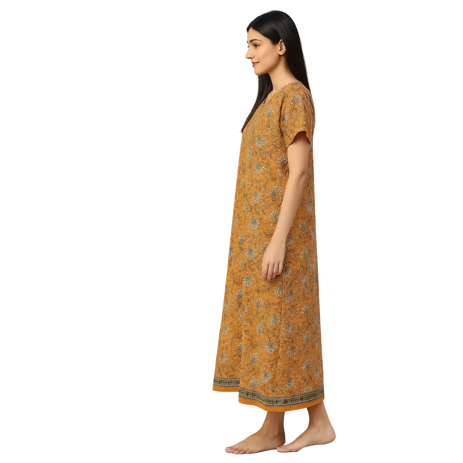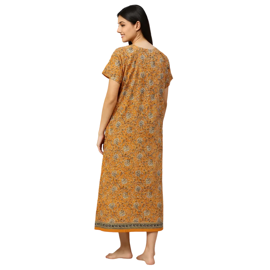 Experience comfort wrapped in elegance with our Mustard Floral Elegance Cotton Nighty, designed for effortless style and all-day ease. Tailored from soft breathable cotton, this nighty features a graceful floral print inspired by traditional Indian patterns. The relaxed A-line silhouette ensures a perfect fall and unrestricted movement, while the round neckline and short sleeves add a touch of simplicity and charm.
