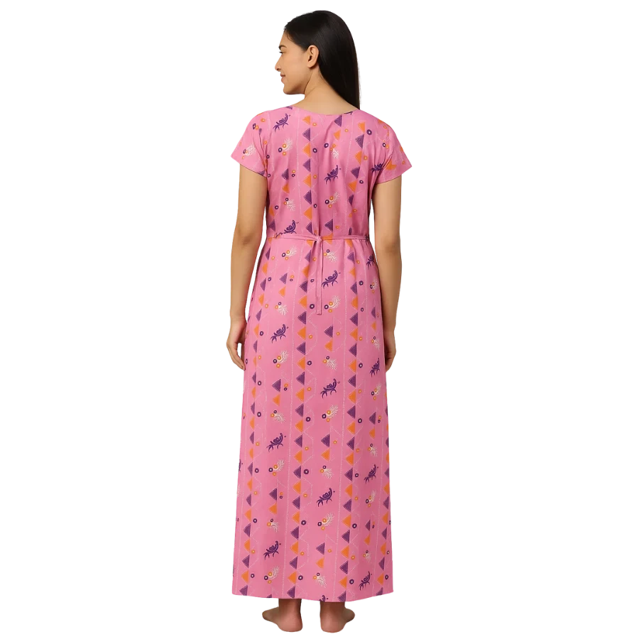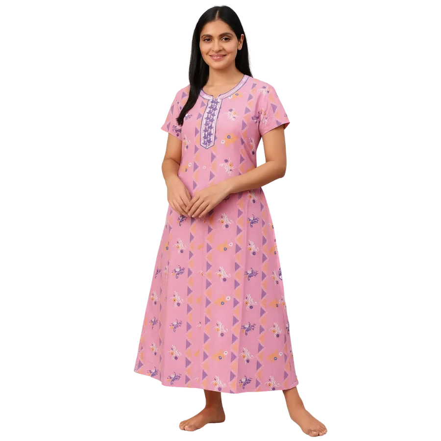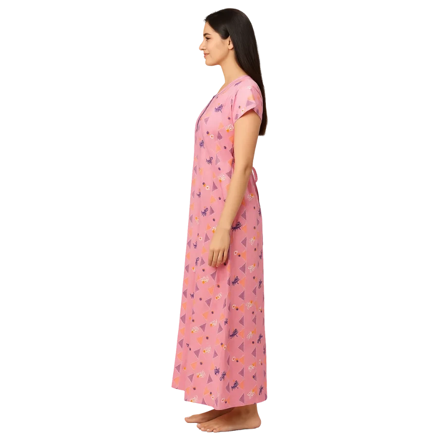 Experience comfort with style in this Pink Blossom Geometric Printed Nighty, featuring a charming blend of triangle geometric patterns and floral motifs in soft pink, purple, and peach tones. Made from breathable, lightweight cotton fabric, this nighty ensures all-day comfort and peaceful night sleep.