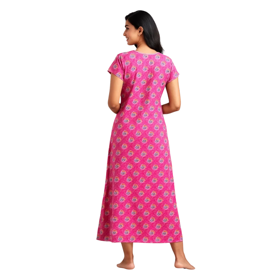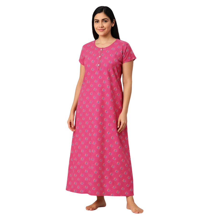Discover effortless comfort with our Pink Paisley Blossom Cotton Nighty, designed for women who love style blended with relaxation. Featuring an all-over mini paisley floral print in vibrant shades of pink, orange and navy, this nighty offers a cheerful and youthful look. Made from soft, breathable cotton fabric, it ensures all-night comfort even in warm climates. The simple round-neck with a front button placket adds ease of wearing and a touch of elegance. Perfect for daily home wear, lounging, and nighttime comfort.