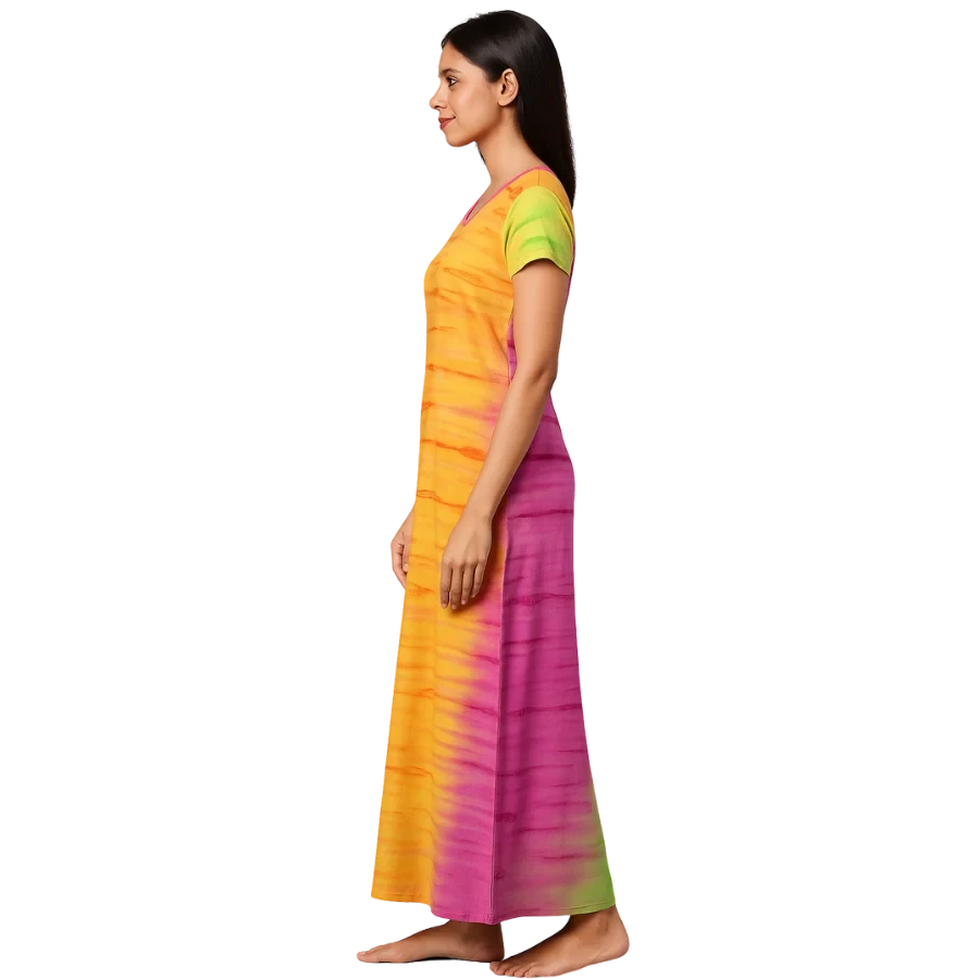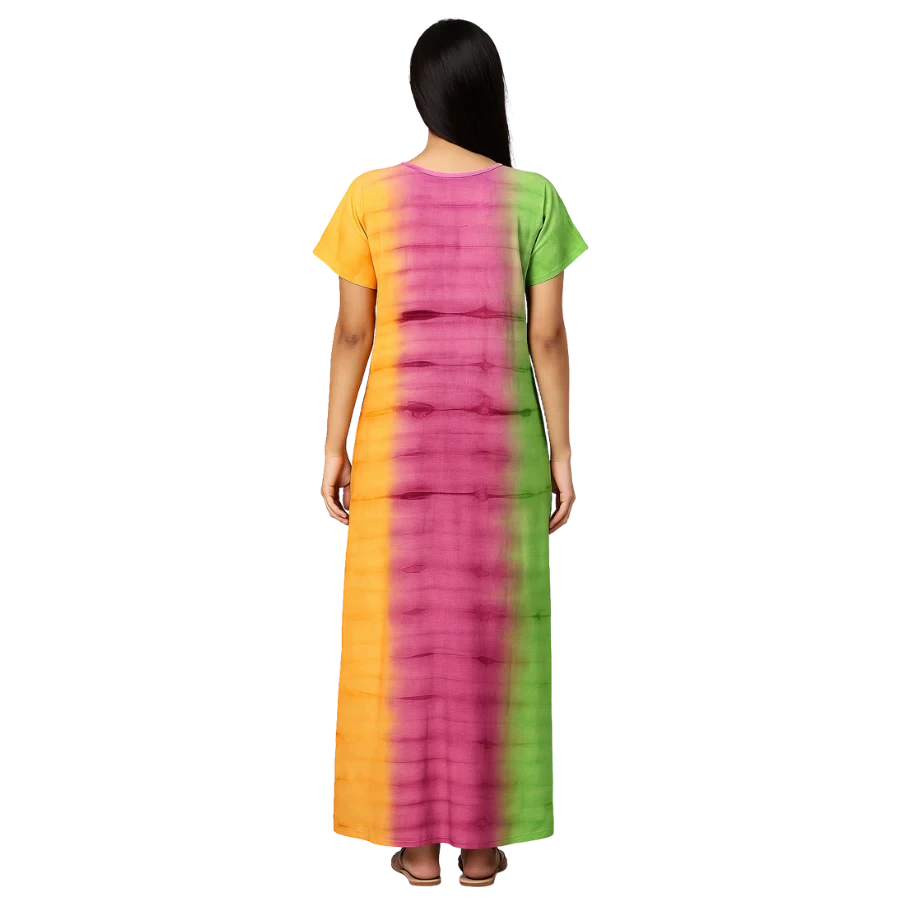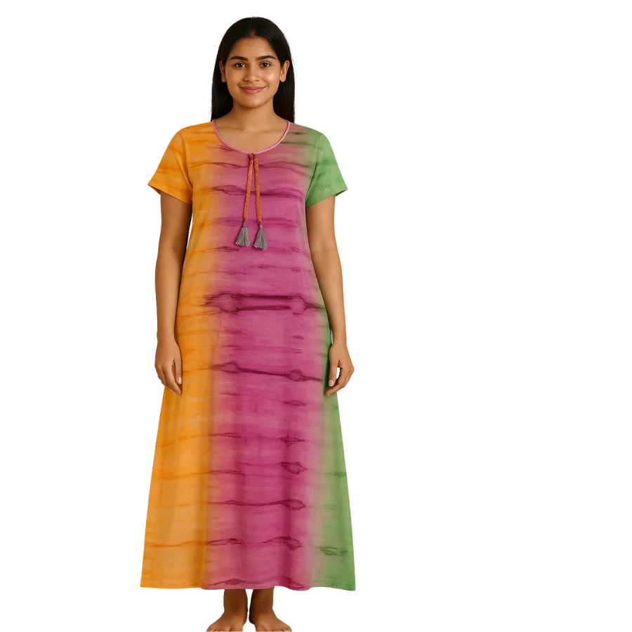 Step into comfort and colour with our Rainbow Ombre Tie-Dye Cotton Nighty, designed for women who love vibrant yet soothing loungewear. This full-length nighty features beautiful soft-blend colour gradients in orange, pink, and green, giving it a trendy fusion look. The neckline is enhanced with cute braided tassel strings, adding a stylish flair to your everyday homewear.