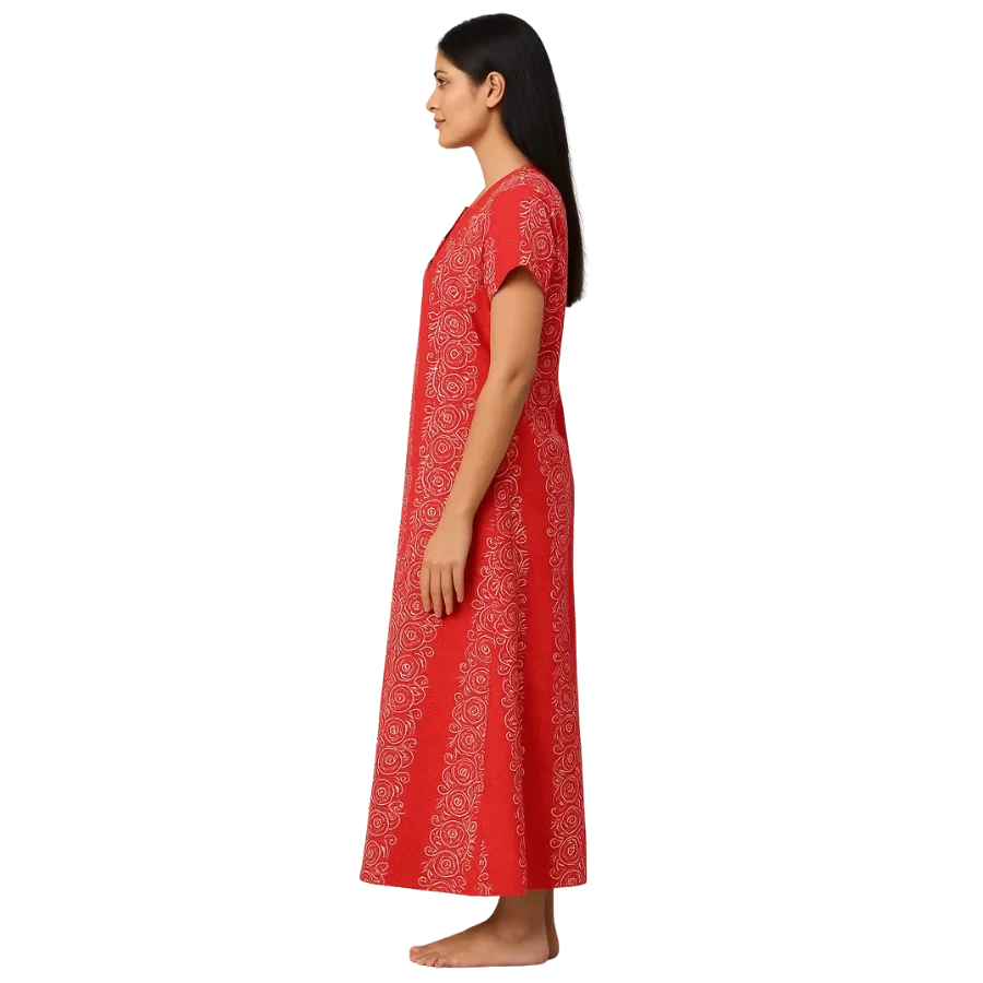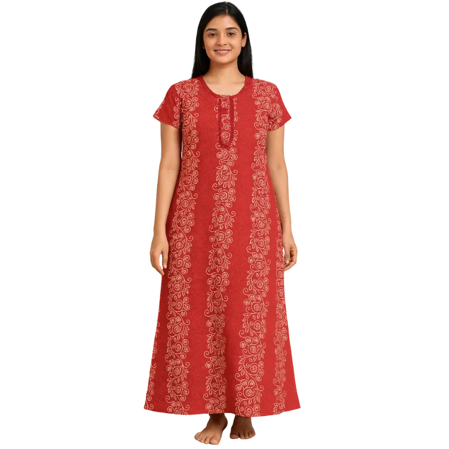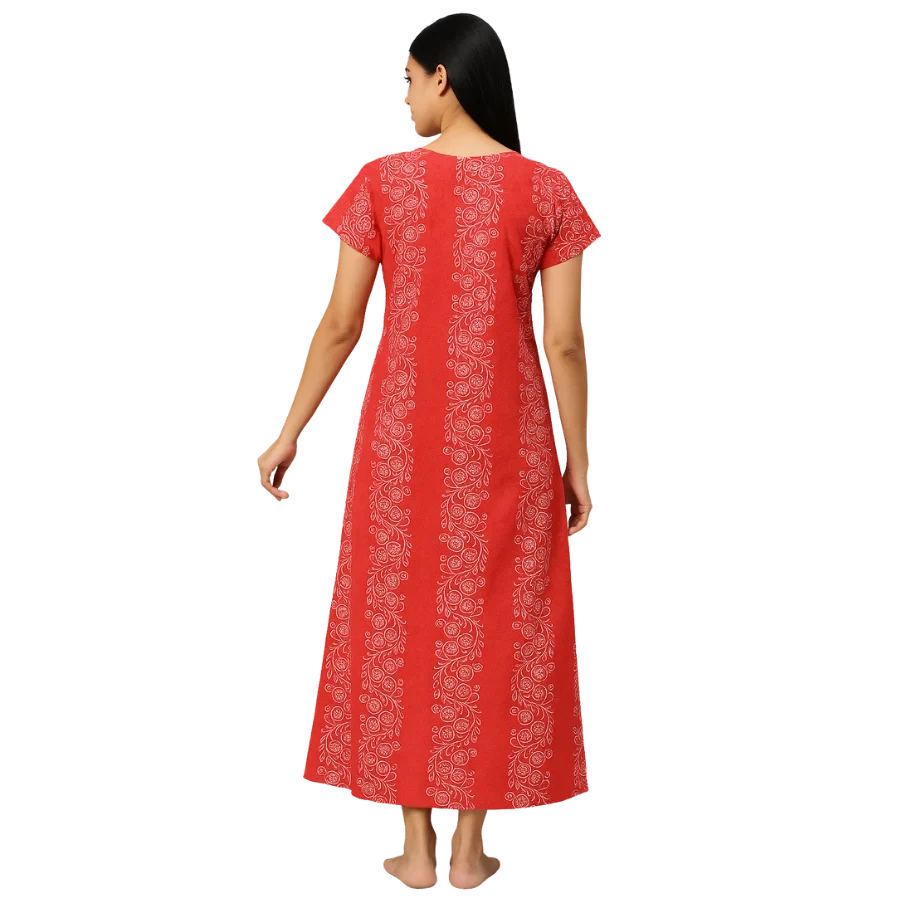 Experience effortless comfort and timeless ethnic charm with this Red Floral Vine Printed Cotton Nighty. Crafted from soft and breathable cotton, this full-length nighty features an eye-catching red base adorned with beautiful vertical white floral vine patterns that enhance its feminine appeal.