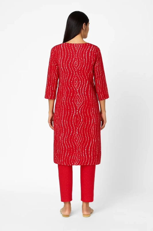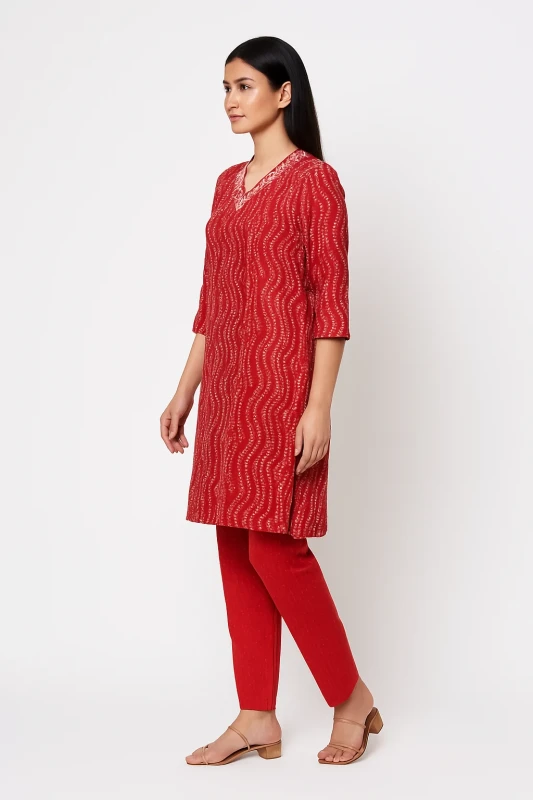 This vibrant red A-line kurta is a blend of comfort and style, perfect for light festivities or casual outings. Crafted from a soft, breathable rayon fabric, it ensures all-day comfort. The front features an elegant floral print design that adds a touch of sophistication to the rich red hue. The design is enhanced with subtle fabric-trim accents and a round neckline with handmade fabric buttons for a polished finish. It also includes convenient side pockets. The 3/4th sleeves complete the look, offering versatile wear for various occasions.