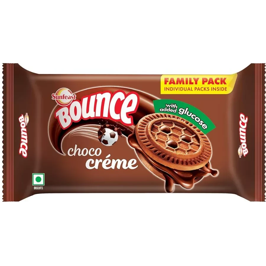 Delight in every bite with Sunfeast Bounce Choco Cream Biscuits – the perfect fusion of crunchy biscuits and smooth, rich chocolate cream. These delicious treats are a favorite among kids and adults alike, offering a burst of chocolatey goodness sandwiched between two crisp layers. Ideal for tiffin boxes, tea-time snacks, or a quick indulgence on the go, Bounce Choco Cream biscuits bring joy and taste together in every pack.