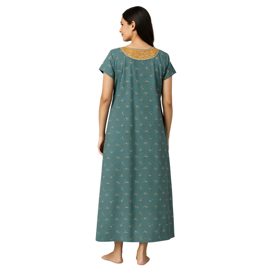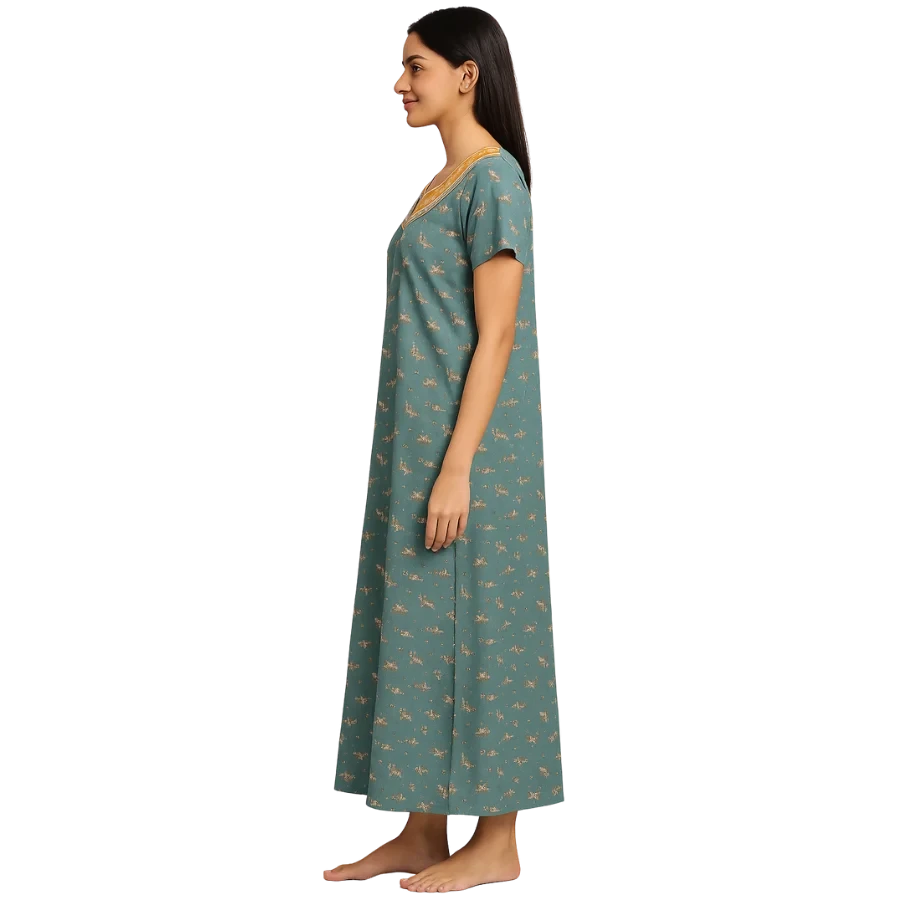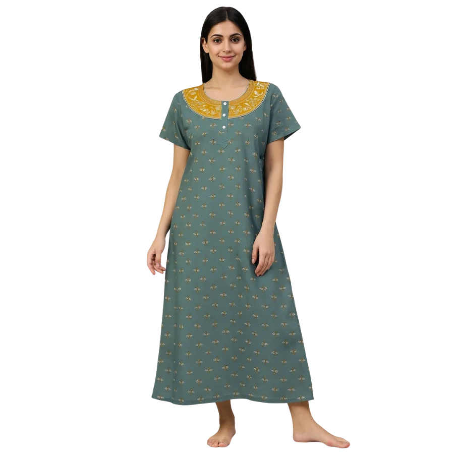 Introducing the Teal Meadow Yoke Printed Cotton Nighty, designed for women who prefer comfort without compromising on style. Made from premium-quality soft cotton, this nighty offers a smooth, breathable, and soothing feel against the skin, perfect for summer and all seasons.