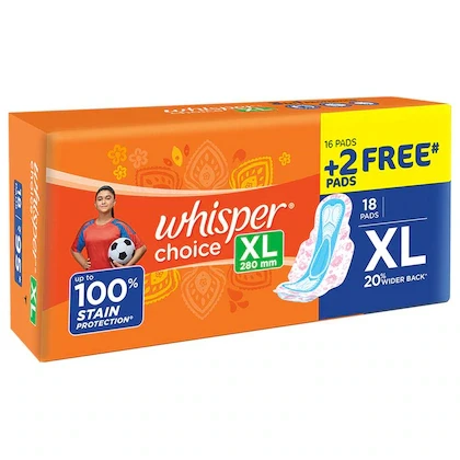 Enjoy advanced period protection at a discounted price with Whisper Choice Ultra XL Sanitary Pads – now 16% OFF. These extra-long pads are specially designed to provide extended coverage with a wide back and soft, cottony top layer for all-day comfort. The super absorbent core locks in wetness and odor, keeping you dry and confident during moderate to heavy flow. Whether you’re on the move or resting, these pads ensure leak-proof protection and rash-free comfort. Take advantage of this limited-time offer and stay protected with Whisper's trusted hygiene care.