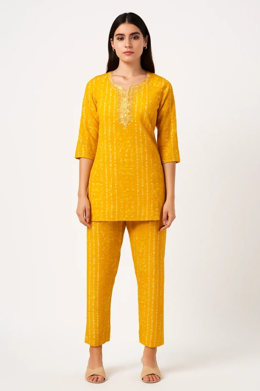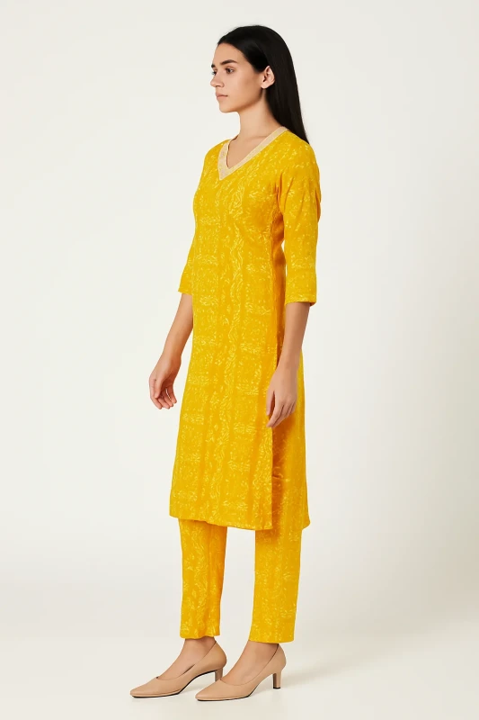 Color & Print: A bright, radiant yellow base adorned with classic white/contrast-colored Bandhani dotted motifs, created using the traditional Bandhan tie-dye technique.